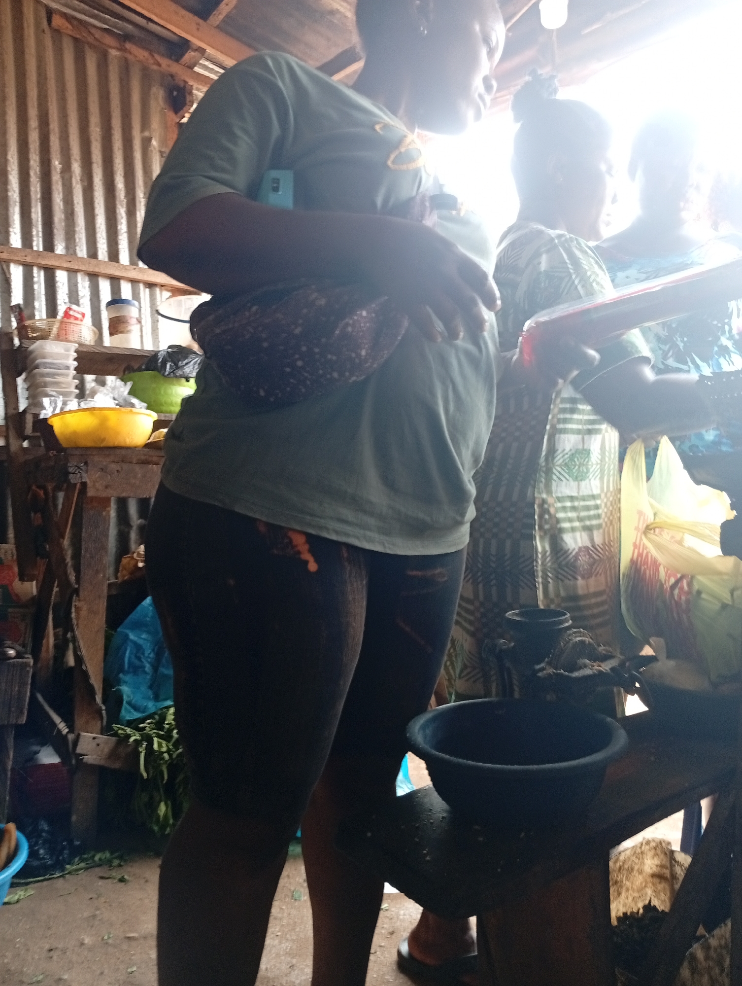 The image depicts an indoor scene, possibly a small shop or market stall, in Owerri, Nigeria. Three dark-skinned women are partially visible in the frame. The primary focus is on the woman in the foreground, wearing a green t-shirt, dark leggings, and a patterned fanny pack around her waist. She is holding a light blue object in her hand, possibly a mobile phone. The other two women stand behind her. The second woman is wearing a patterned top. The third woman's face is partially obscured by bright light. In the background, on a rickety wooden shelf, are several containers, including yellow and green bowls. The interior structure seems to be made of corrugated metal sheets. On a lower wooden table, there are black bowls and what appears to be a grinding machine. Some vegetables are visible on the ground. The overall lighting is uneven, with areas of bright sunlight and deep shadows.