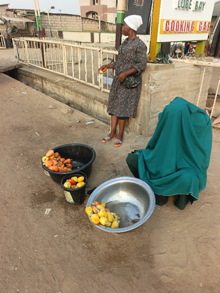 Two women are on a street. One stands next to a cooking gas sign, wearing a headscarf and patterned dress. She holds something in her hand. The other woman squats, covered entirely by a green cloth. Three containers of cashew apples are displayed: a large black tub, a small black bucket, and a metal bowl. The ground is paved. A white metal railing lines a raised sidewalk.