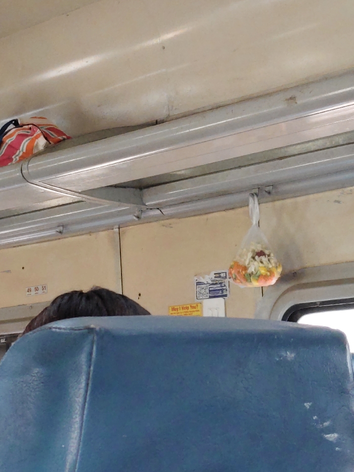 Inside a train, a blue seat is in the foreground, behind which sits a person with black hair. Above, a metal luggage rack holds a red and orange striped bag. A clear plastic bag filled with colorful food hangs from the rack, near a window. The train's interior wall features signage including a yellow "May I Help You?" poster, next to a QR code. Numbers "49, 50, 51" are also visible on the wall.