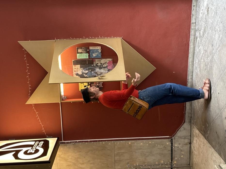 An adult male stands outdoors, turned to his right, observing a record display case set into a red wall