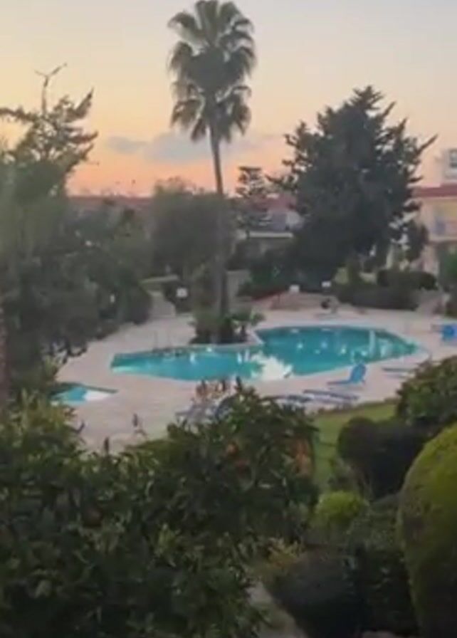 The video presents a high-angle view of a swimming pool situated among lush greenery and residential buildings