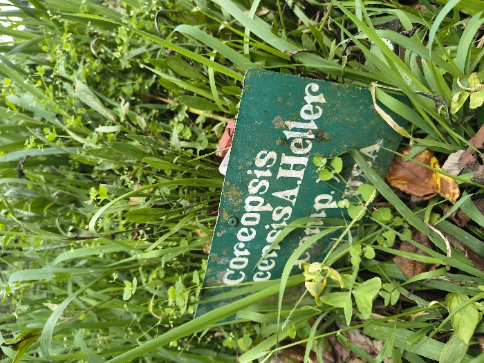 A green sign bearing the words "Coreopsis censis" and "A. Heller" lays askew amidst overgrown grass. Small, green plants, some with clover-like leaves, are scattered around the sign. A dried brown leaf rests on the lower right edge. The sign appears aged and weathered, blending somewhat into its natural surroundings.
