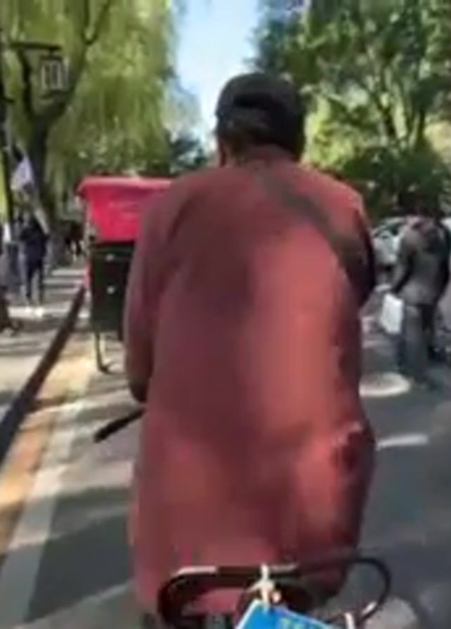 From a cyclist's point of view, the video shows a sunny day with trees and people walking along a sidewalk. The cyclist is behind a man in a maroon robe and black cap. A red-topped rickshaw is attached to the bicycle. People are walking in both directions. There are shops and a body of water on the left. Someone in a red jacket walks directly in front of the camera.