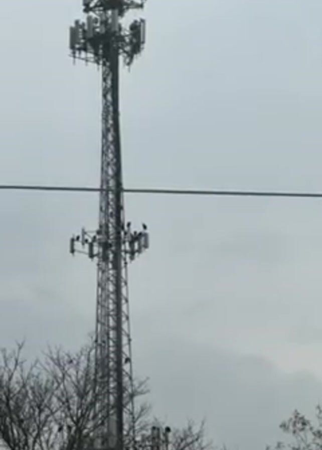 tall communication tower against an overcast sky. The tower is constructed of metal lattice and has multiple tiers of antennas and equipment mounted on it. Several birds are perched on the tower's structure. Bare tree branches are visible in the foreground, and power lines cut across the upper portion of the frame.