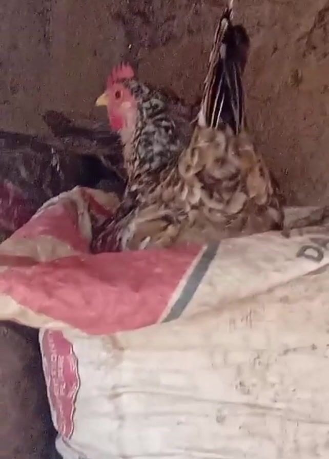 A brown and white hen sits on a bag that is primarily white with some red and grey stripes. The hen crows. The bag is in a corner that looks like a dirt structure or wall.