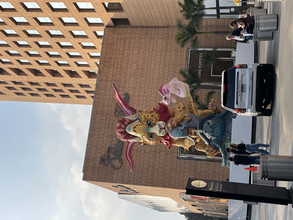 A large, colorful sculpture featuring a jaguar, a turtle, and a pink creature stands outside a building, next to a Louis Vuitton store, with a Saks Fifth Avenue sign visible. People are standing near the sculpture. A white SUV is parked nearby. Another building with a grid-like pattern of windows is also visible, along with a clear sky.