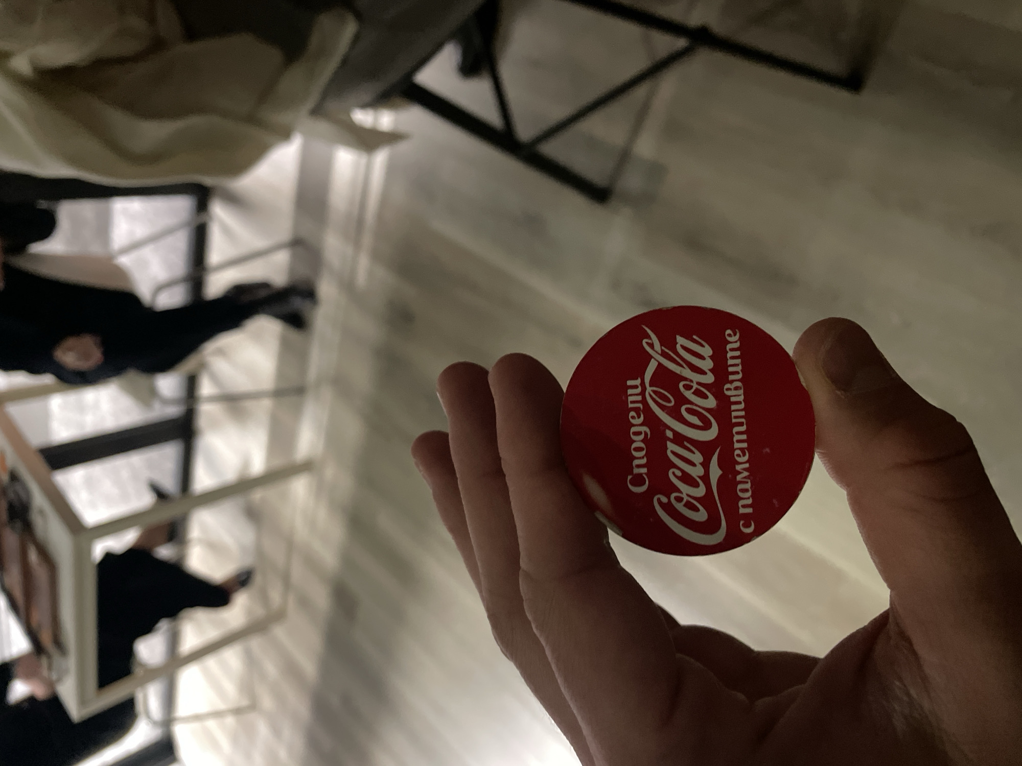 A hand is holding a Coca-Cola button in a room. The button is red with white Coca-Cola lettering in Cyrillic, with the phrase "Сподели Coca-Cola с паметливи" printed on it. The room has a wooden floor and white walls. In the background, there is furniture including a white-framed side table and a chair. The person holding the button appears to be in the room with the furniture, perhaps taking a picture of the Coca-Cola button. Without further information or context, it is impossible to pinpoint the specific location in Sofia, Bulgaria.