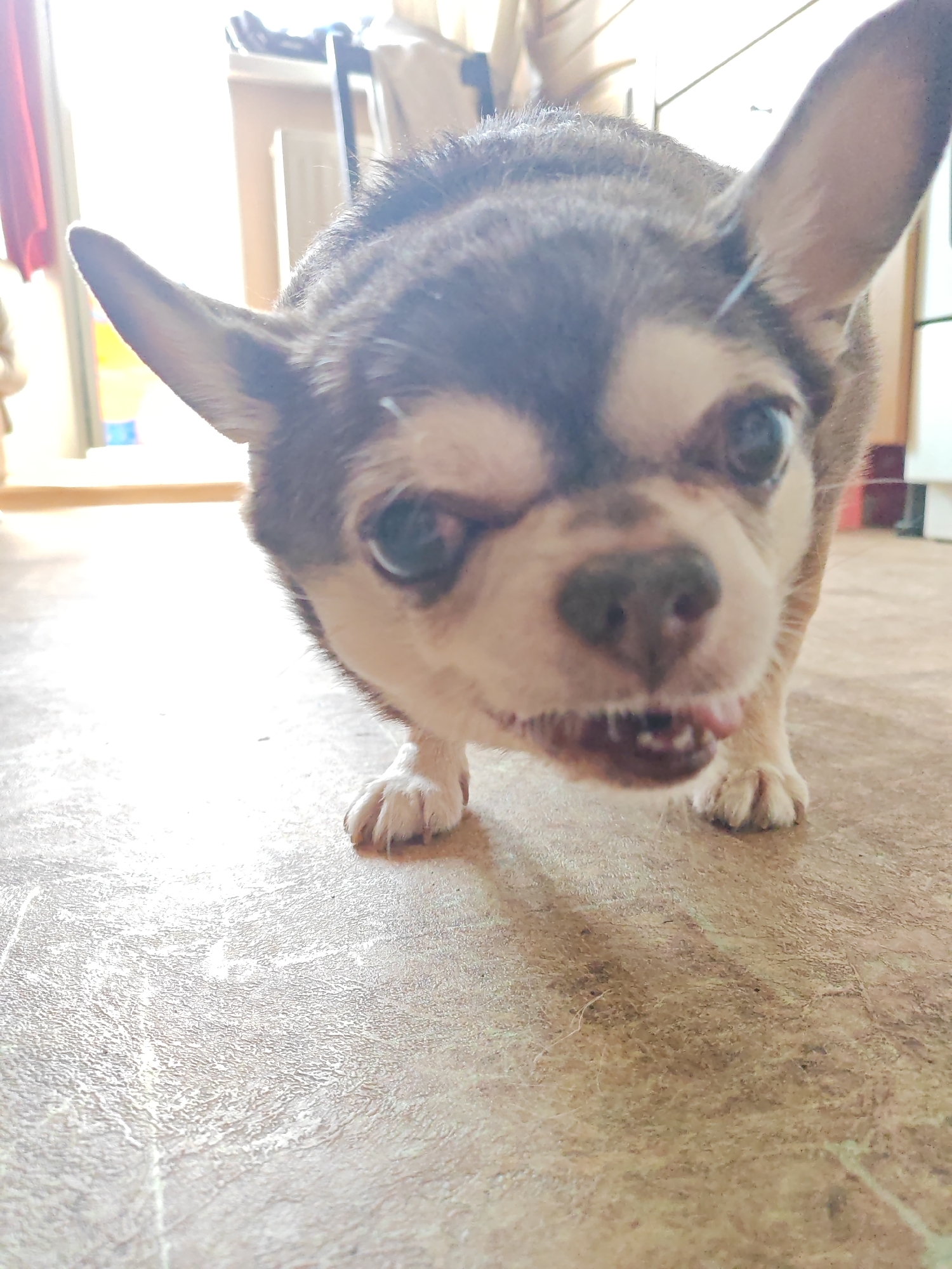 A close-up shot depicts a small dog, likely a Chihuahua mix, with a distinctive brown and white coat, standing on a textured, light brown floor. The dog's face is the focal point, revealing an expressive face with slightly bared teeth. The background is out of focus but suggests an indoor setting, potentially a domestic residence with a window and light fixtures. The location of the image cannot be determined as Saint Petersburg, Russia, based on the available information.