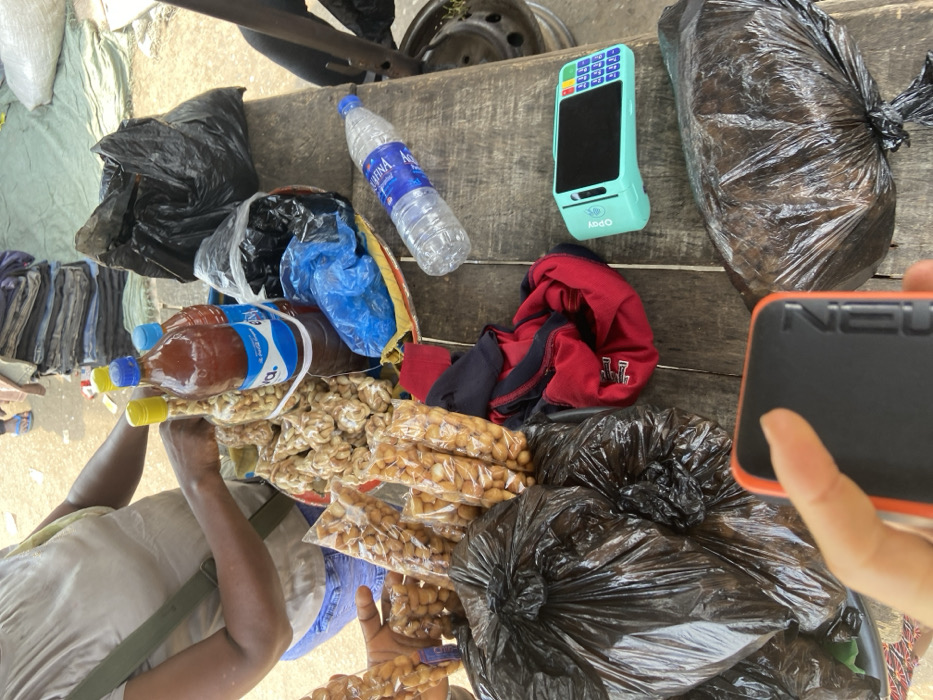 The image depicts an outdoor market scene in Onitsha, Nigeria, observed from a slightly elevated perspective, likely from a customer's viewpoint. **People:** A vendor, identifiable by dark skin and wearing a light-colored top with a green shoulder strap, is positioned behind a wooden stall. Her hands are visible, one resting near packaged food items, suggesting engagement with the goods. In the foreground, a hand with lighter skin holds a dark grey and orange rectangular electronic device branded "NEU," indicating the presence of a customer or photographer. In the blurred background, several indistinct figures are visible, consistent with a busy market environment. **Objects and Actions:** A rustic wooden table serves as a display surface for various items. These include multiple clear plastic bags containing light brown, rounded snacks, possibly groundnuts, arranged in piles. A circular red and yellow tray holds more of these snacks, some individually wrapped, some loose. Two plastic bottles, one with a yellow cap and one with a blue cap, contain a dark brown liquid and similar groundnuts, labeled "Aqua..." (likely Aqua Viva). An Aquafina-branded plastic water bottle lies horizontally on the table. Payment infrastructure includes a light teal "Opay" branded Point of Sale (POS) terminal with a black screen and a numeric keypad, indicating electronic payment capabilities. Several black plastic bags, some tied and full, are scattered across the table, along with a crumpled red garment. Two large, tied black plastic bags are visible in the lower left and lower right of the frame. **Environment:** The scene is brightly lit by natural daylight, consistent with an outdoor setting. The ground in the background appears dusty or unpaved, with stacks of folded clothing or textiles visible on other market stalls, further affirming a bustling market atmosphere.