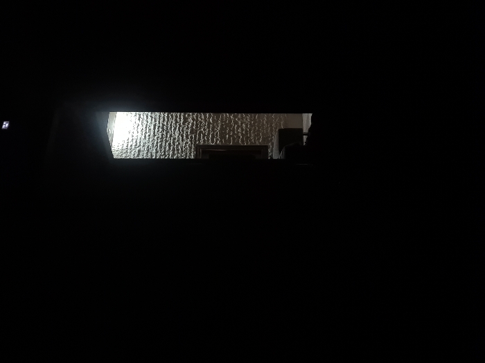 The image depicts a nighttime scene in At-Tall, Syria, dominated by darkness in the foreground, obscuring any immediate external environment. On the right side of the frame, a vertical, rectangular opening reveals a brightly illuminated interior space. This interior features walls constructed from light-colored, textured stone or brick, characterized by an uneven surface and visible mortar lines, intensely lit by an unseen overhead light source. Near the bottom of the illuminated section, a dark, indistinct object, possibly a piece of furniture such as a low bench or sofa, is partially visible. Above this object, a rectangular dark area suggests a window or a recessed opening. No individuals, specific actions, or interactions are discernible within the visible portions of the scene.
