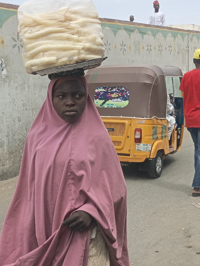 In Fagge C, Nigeria, a young Black female, likely a vendor, is depicted walking on a paved surface