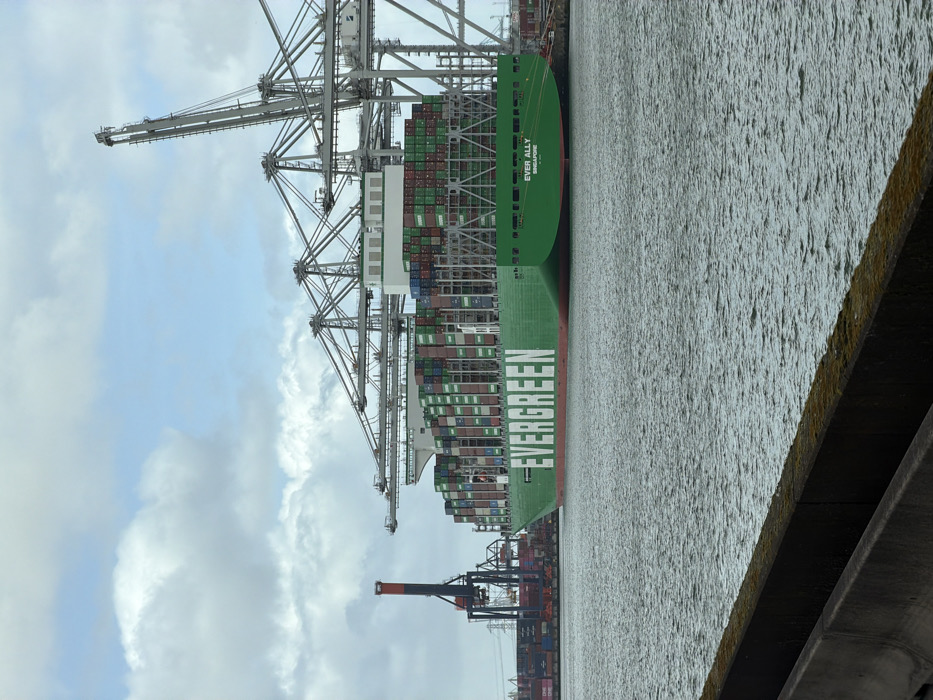 - "The image displays the container ship *Ever Ally*, registered in Singapore, with "EVERGREEN" prominently displayed in white lettering on its green hull, situated in a waterway within Maasvlakte, Rotterdam, Netherlands" by FM-t0J7C2, licensed under CC BY 4.0