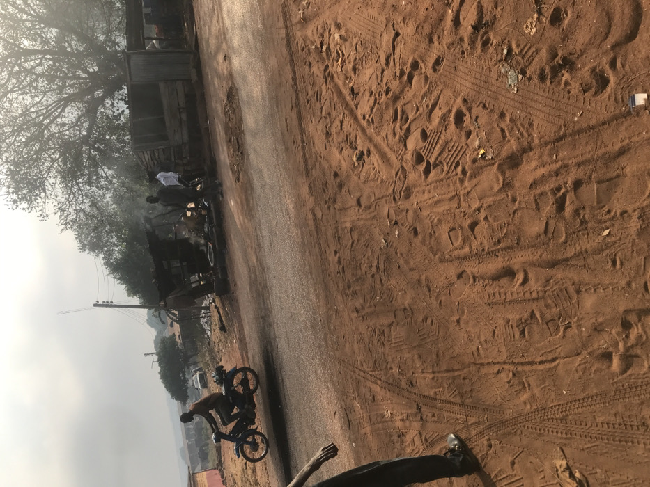 A roadside scene in a village. A group of people gather around a smoking vehicle near a wooden structure beneath a tree. A man rides a small motorbike down the asphalt road, while a dirt shoulder is marked with footprints and tire tracks. Hazy atmosphere with buildings and greenery visible in the distance. A shoe and leg of another person are visible in the lower right corner.