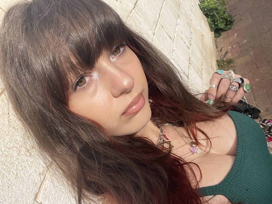 A fair-skinned young woman with shoulder-length brunette hair and red streaks poses for a selfie. Her makeup is minimal with glossy lips and a touch of highlighter. She wears a green top and several necklaces featuring pendants like a Star of David. Her hand is adorned with multiple rings, some with colorful stones. A brick wall serves as a background, and some greenery is visible in the upper right corner.