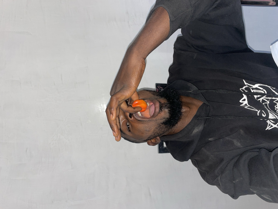 A man with dark skin and a beard holds a bright orange chili pepper to his mouth. He wears a black hooded sweatshirt with a graphic design on the front. One hand is close to his face, seemingly holding the pepper in place. The background is a textured off-white or gray wall. The photo is slightly rotated counter-clockwise.