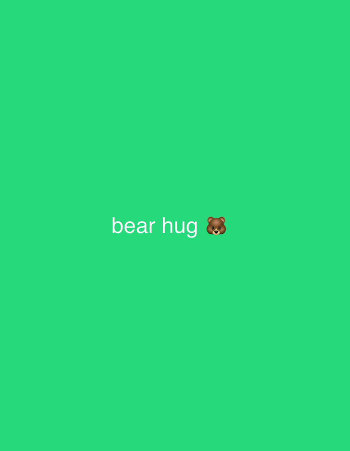 The digital graphic, located in Tunbridge Wells, United Kingdom, displays a solid, uniform green background. White sans-serif text, "bear hug," is centrally positioned. A small brown bear head emoji with rounded ears, a light-brown snout, and dark eyes appears immediately to the right of the text. No individuals, physical objects, actions, or interactions are visually represented.