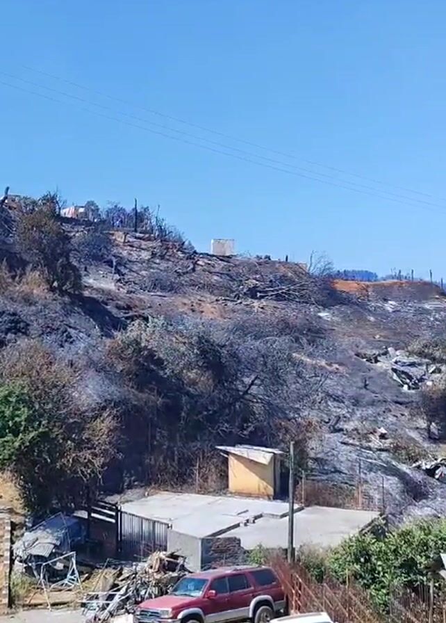 neighborhood with a burned hillside in the background. The hillside is charred, with some remnants of trees and structures visible. In the foreground, there are several houses, some of which appear to be intact. There are also several cars parked on the street. The sky is clear and blue. The overall scene suggests the aftermath of a fire.
