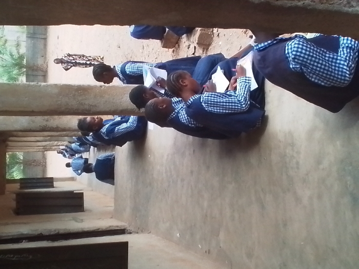 The scene depicts an outdoor educational environment located on a covered concrete walkway adjacent to a building in Tabu, Nigeria