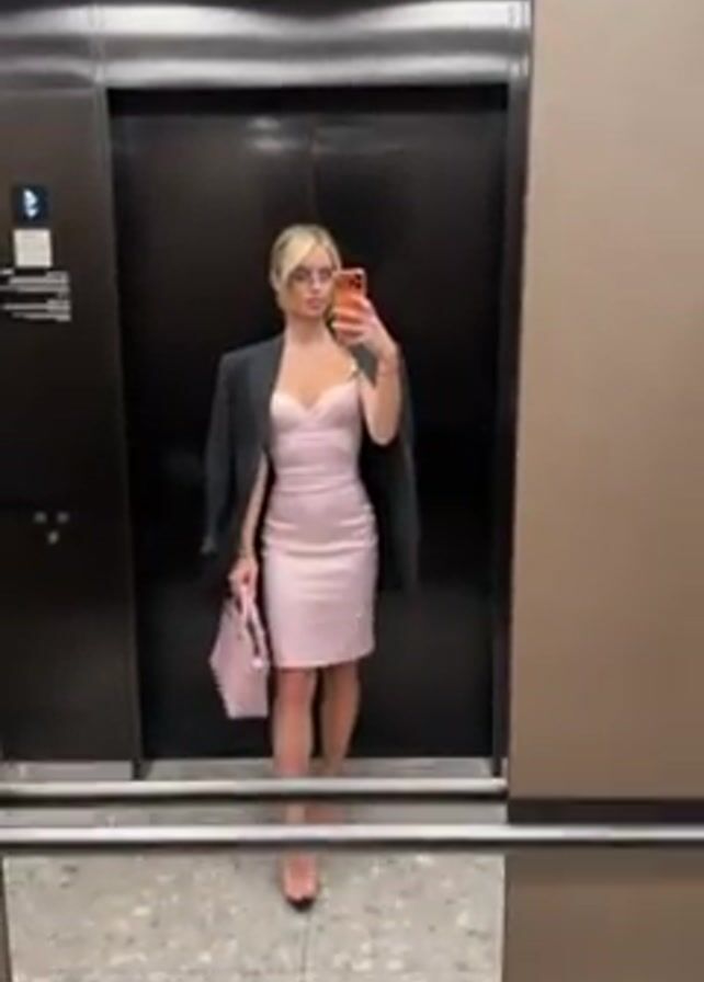 A woman stands in an elevator and takes a selfie with her phone. She has blonde hair and is wearing a light pink dress, a gray blazer draped over her shoulders, and sunglasses. She is holding a light pink handbag. The elevator has a mirrored wall, revealing the elevator doors. The floor is tiled.