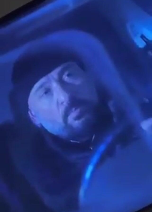 A video shows a man sitting inside a car. The man is wearing a black beanie and a black jacket. He has a beard and mustache, and he is holding a cell phone up to his ear. The interior of the car is illuminated by a blue light.