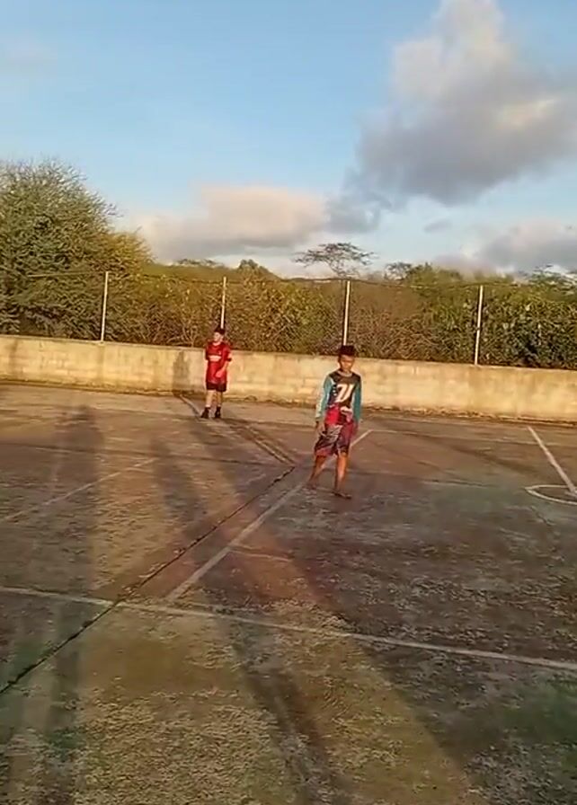 three boys playing soccer on an outdoor concrete court. The court has painted white lines and a center circle. A low concrete wall topped with a chain-link fence surrounds the court, and trees and shrubs are visible behind the fence. A tall utility pole stands near the edge of the court. The sky is blue with scattered clouds. One boy wears a white t-shirt and red shorts, another wears a red t-shirt and black shorts, and the third wears a teal and black patterned shirt and dark shorts. The boy in the red shirt dribbles a soccer ball.