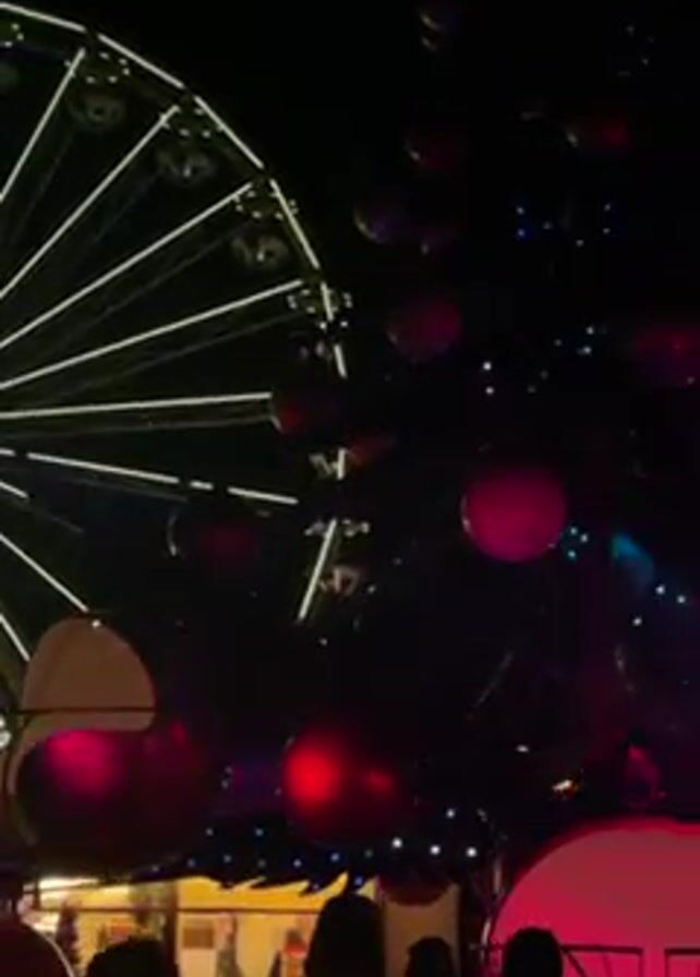 - "At night, a Ferris wheel, illuminated with white and red lights, stands behind an artificial Christmas tree adorned with large red ornaments and blue string lights" by FM-euyLP2, licensed under CC BY 4.0