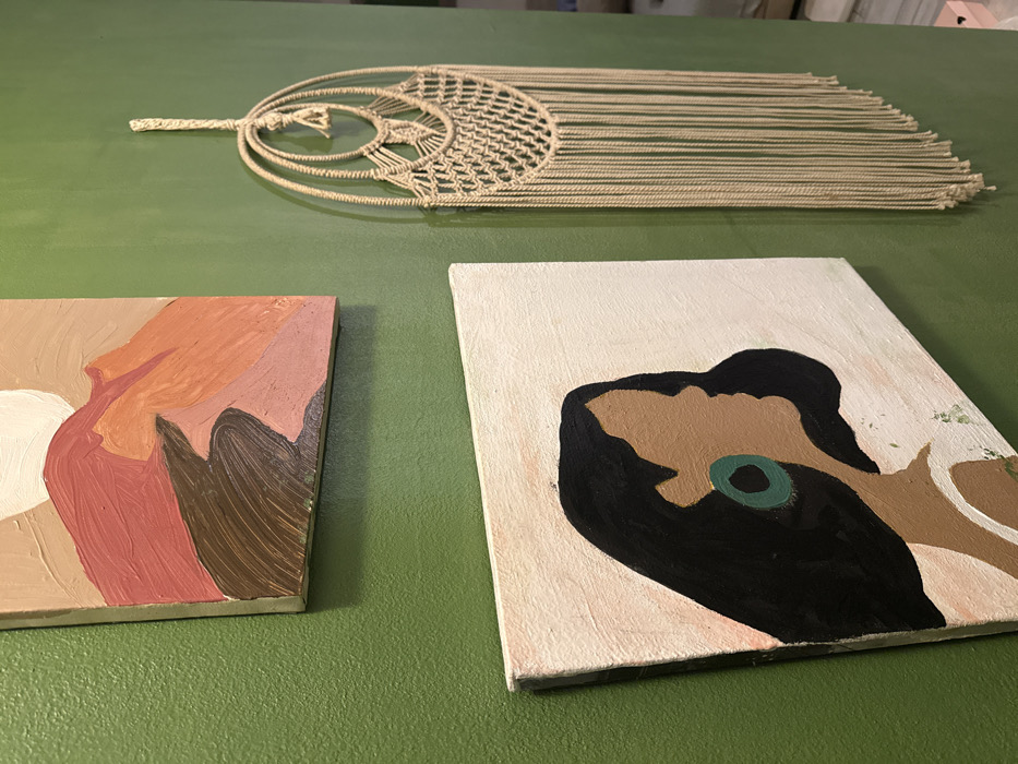 Two small abstract paintings and a macrame wall hanging sit on a green surface