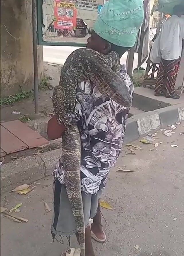 Here's a detailed description of the video: A person, appearing to be a young adult, is carrying a large monitor lizard on their shoulder. The person is wearing a black and white patterned shirt, gray shorts, and sandals. They also have a light green fabric wrapped around their head. The lizard is substantial in size, with a long tail that extends to the person's knees. Its skin is patterned with dark spots on a lighter background. The person is standing on a sidewalk next to a street. Behind them is a green sign that reads "FEDERAL REPUBLIC OF NIGERIA". Other objects in the background include a bicycle, a wooden structure with tables and benches, and other people walking by. The person moves slightly while carrying the lizard. They are positioned close to the curb of the street. The general environment looks like a busy street in a somewhat urban area. There are leaves scattered on the ground. A man dressed in traditional attire approaches the person as the clip ends.