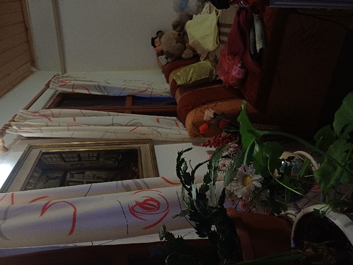 This image captures an interior scene, depicting a room within a residence in Dolna Oryahovitsa, Bulgaria. The lighting is dim. On the left side of the frame, several potted plants are arranged in the foreground, utilizing various containers including terracotta-colored and white ceramic pots with blue patterns. Behind the plants, two sets of white curtains adorned with red-orange and grey abstract or swirling patterns are suspended from a wooden curtain rod. Between these curtain panels, a framed painting with a gold-colored frame is mounted on a light-colored wall; the artwork depicts a dark interior architectural scene, possibly an alley or a room with multiple windows. The right side of the image features an upholstered sofa, predominantly brown and orange in color, furnished with several cushions including striped, solid orange, and a light green/yellow cushion. Resting on the sofa are a light brown teddy bear and another dark-hatted stuffed figure. A light yellow fabric is draped over the sofa's backrest. On the sofa seat, folded red and green/grey patterned fabrics are visible. Artificial red berries and light-colored flowers are positioned near the sofa's left armrest. The ceiling in the upper right portion of the room is constructed from light-toned wooden planks. No individuals are present in the scene.
