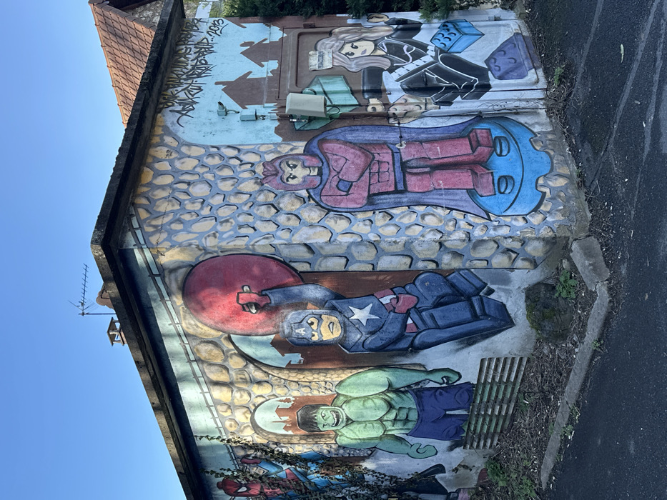 Located in Orsay, France, this image captures a rectangular, single-story utility building brightly illuminated under a clear blue sky. The building is extensively covered in colorful graffiti artwork, primarily depicting comic book characters rendered in the style of Lego minifigures against a faux stone-patterned background. On the visible left wall, a red-suited Spider-Man figure is climbing, partially integrated with green vine-like elements. The front wall features a green-skinned Hulk in purple pants, standing within an arched frame, positioned left of a blue-suited Captain America. Captain America, holding a red shield raised overhead in his right hand, appears to emerge from a darker arched outline. At the front-right corner, a red-suited Magneto, complete with a purple cape and helmet, stands with crossed arms on a blue circular Lego base. The adjacent right wall displays a blonde-haired female character in a black outfit, seated on a blue Lego brick and holding a smaller purple Lego brick. Above this figure, several brown house silhouettes are painted against a light blue background, with blue graffiti text, including a tag and the year "2013," visible higher up. A small grey utility box is mounted on this section of the wall. The building's walls simulate a pattern of irregular beige and grey stones with blue mortar lines. A horizontal metal ventilation grate is located at the base of the front wall. The flat, dark-colored roof of the building supports a television antenna and a small chimney stack. The foreground comprises a dark asphalt surface bordered by a concrete curb, with sparse green vegetation and bare soil at the building's base. In the background to the right, a section of a building with an orange-brown tiled, sloped roof and green foliage is visible.