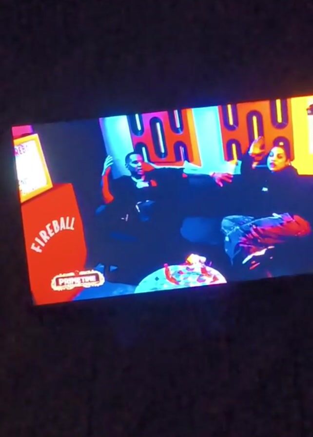 television screen displaying a vibrant scene featuring two people seated on a couch, possibly in a studio setting. To the left of the screen, there is a promotional graphic for Fireball whiskey. In front of the people on the couch, there is a partially eaten pizza on a small table. The background features a retro-themed design with orange and turquoise color scheme. The people are dressed in casual attire. The overall scene appears to be from a television show or online broadcast.