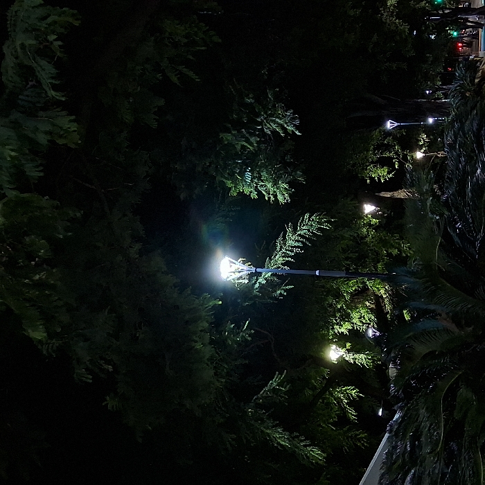 The image depicts a nighttime scene within Plaza 25 de Mayo, San Fernando del Valle de Catamarca, Argentina. A prominent, modern street lamp featuring a white, multi-faceted, diamond-shaped LED fixture is centrally positioned, emitting bright white light that produces a visible lens flare. This lamp is mounted on a dark-colored pole. Dense, dark green foliage from large trees, likely mature, occupies the upper two-thirds of the frame and extends into the background, creating areas of deep shadow. Lower-growing, dark green palm-like plants are visible in the immediate foreground. Multiple similar street lamps recede into the background along a pathway or median strip on the right side of the frame. On the far right, a street is discernible with a traffic light displaying both green and red illumination, indicating an active intersection. A partial blue informational sign is also visible near the street. No people, vehicles, or animals are present within the observable scene. The environment appears to be a well-lit urban park or plaza at night, characterized by robust tree cover and modern public lighting.