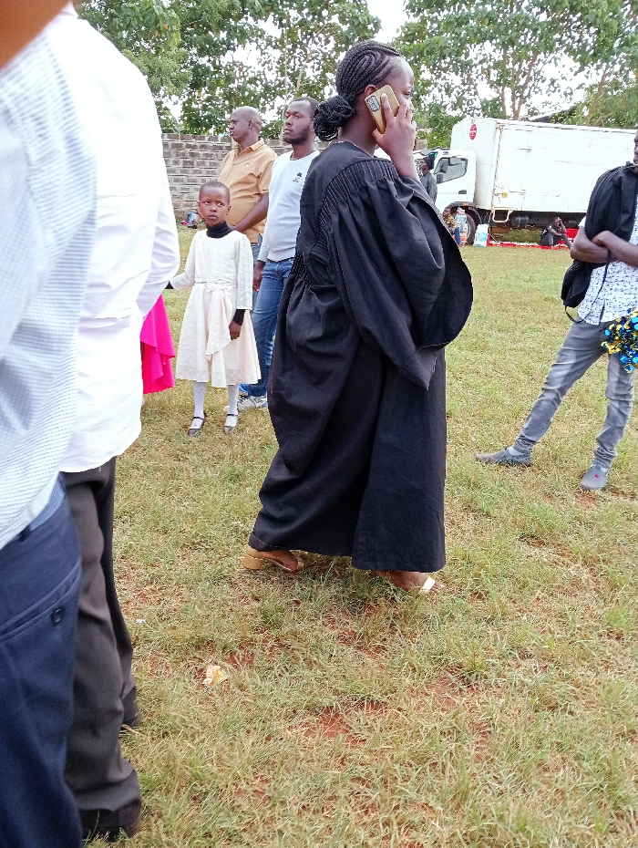 A woman in a black robe talks on her phone. Behind her are several people, including a child in a light-colored dress. A white delivery truck is parked in the background. The people stand on grassy ground. The woman wears golden sandals. A man to the left is partially cropped out of the image.