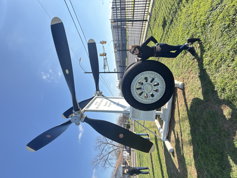 A woman in black clothing and sunglasses poses on a large aircraft tire mounted on a white stand. Behind her is a multi-blade propeller and a sign that reads "B-36 Peacemaker Bomber Propeller." The scene is outdoors, with a blue sky, green grass, and a chain-link fence in the background. Street lights and buildings are visible in the distance. The image appears to be rotated.