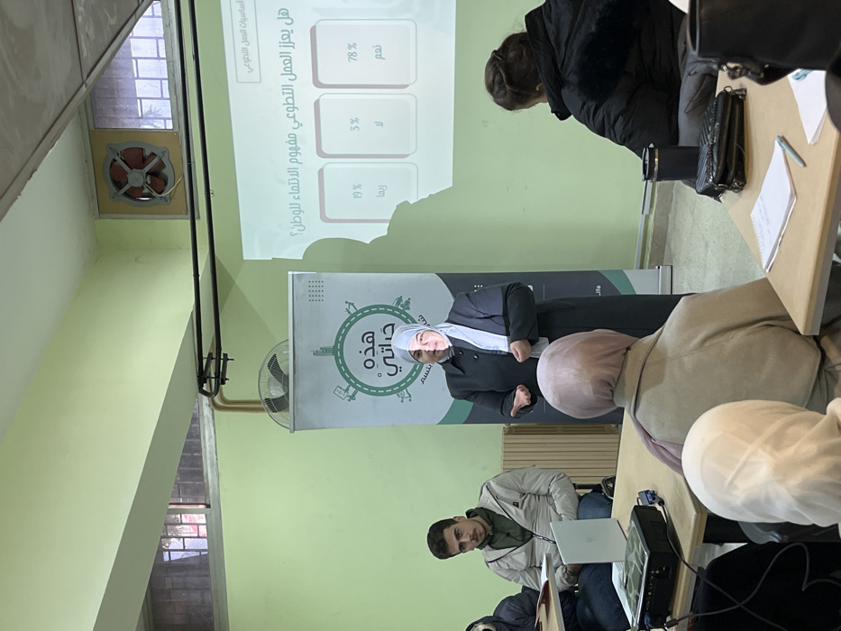 An indoor scene in Al-Mazza Municipality, Syria, depicts a presentation or lecture in progress