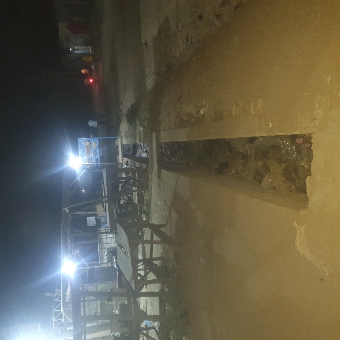 A nighttime shot captures a street scene with varying light sources. A brightly lit food stall stands out, contrasting with a dark drainage ditch running alongside the road. Further down the street, faint red tail lights of a vehicle are visible. The overall ambiance is dim, with the stall being the focal point amidst the darkness.