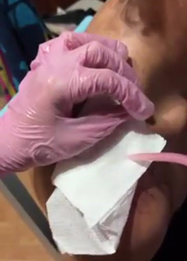 close-up of a person's shoulder being wiped with a white tissue by a person wearing pink gloves