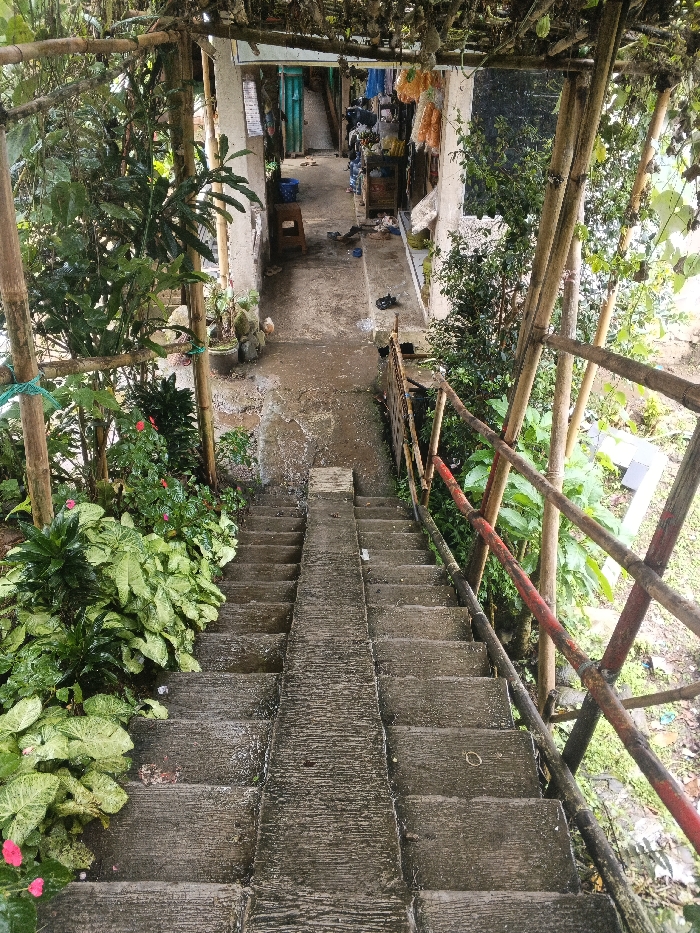 This image depicts a downward view of a concrete staircase and walkway in Bien Hoa, Vietnam. The scene features a multi-tiered concrete staircase descending towards the viewer, textured with horizontal grooves and appearing wet with streaks of water. To the left of the stairs, a dense array of lush green plants, including large-leafed varieties and smaller shrubs with pink flowers, thrives beneath a bamboo support structure secured with green twine. A rustic railing, constructed from weathered bamboo poles with intermittent red markings, borders the right side of the staircase, with additional foliage visible beyond it. Overhead, a canopy of bamboo poles and dried vines forms a partial covering. At the top of the stairs, a narrow, wet concrete walkway extends into the background, flanked by light-colored walls. The left side of the walkway shows a blue-green door and several potted plants. On the right, various items, including hanging objects (possibly dried goods or decorations), are visible along the wall. Scattered footwear, including sandals and slippers, along with a small wooden stool, are present on the walkway. A small, light-colored fowl (chicken) is observable near potted plants on the left side of the distant walkway. No human figures are present.
