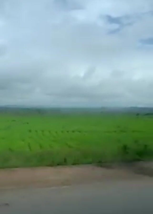 view from a moving vehicle. The view consists of a green field extending to the horizon under a cloudy, overcast sky. A road is visible in the foreground.