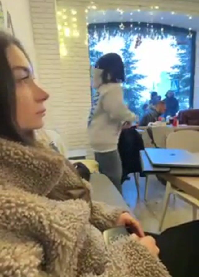 A woman in a tan sherpa jacket sits on a gray sofa in what appears to be a cafe. She has dark hair and is looking off to the right. Behind her, another woman in a gray hoodie and jeans sits at a table with a laptop. Through the large window, snow-covered trees and a few people can be seen outside. There's dance music playing.