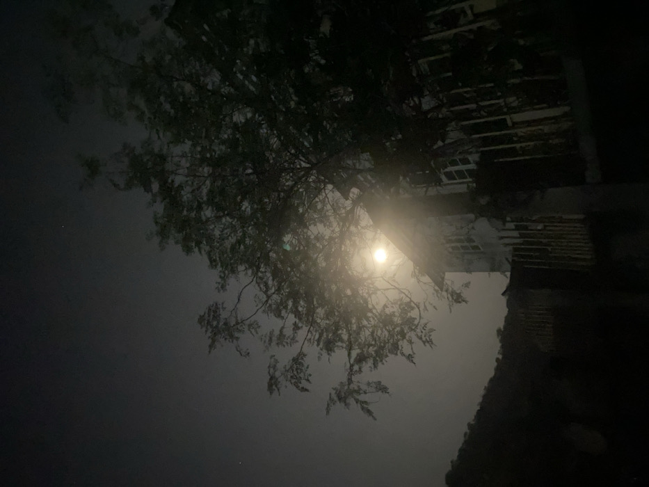 A nocturnal view captures a full moon radiating light through a tree's delicate branches. The tree partially obscures the moon, creating a soft glow around its edges. To the right, the facade of a building peeks through the darkness, hinting at aged architecture with visible windows. The scene's dim lighting and muted tones contribute to a mysterious and atmospheric ambiance.