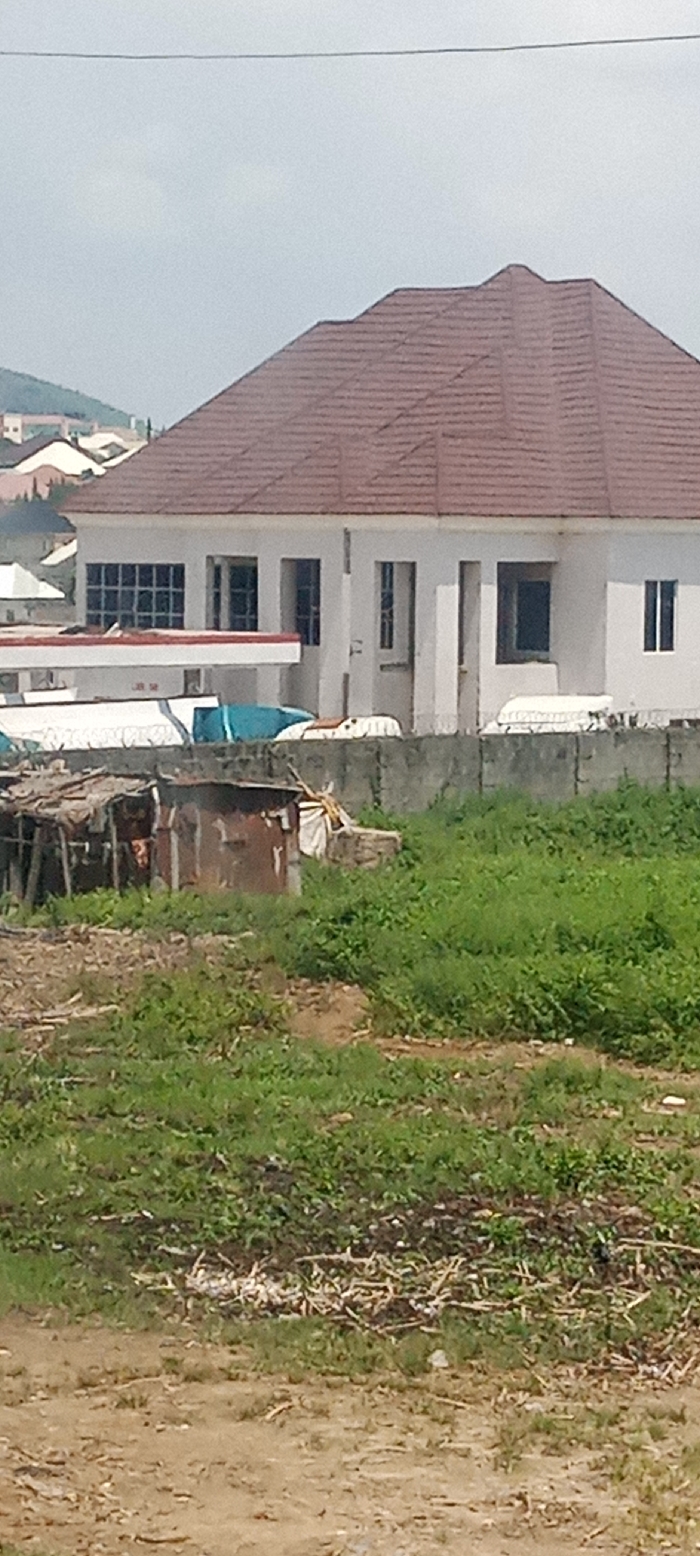 The image depicts an outdoor scene in Iddah, Nigeria, under a hazy sky. The foreground consists of an unpaved dirt path transitioning into sparse green vegetation with scattered dry debris. Two rudimentary structures are present: a dilapidated wooden shack with a makeshift roof on the left, and a rust-colored, cylindrical metal container to its right. A light gray concrete block wall, topped with multiple strands of barbed wire, spans the mid-ground. Behind this wall, partially obscured, is a white structure with a horizontal red stripe, possibly part of a canopy or signage associated with a fuel pump. A blue tarp covers objects directly behind the wall, and several white, irregularly shaped covered items are visible. The background is dominated by a substantial, single-story, white-painted building featuring a reddish-brown multi-hipped tiled roof. The building has various rectangular windows, some with visible grilles, and narrow vertical openings, likely door frames. In the far background, other white buildings with red roofs are visible on distant, sloping terrain, leading up to bluish-green hills under a uniformly light gray sky. A thin, dark utility wire traverses the upper portion of the sky. No individuals or active interactions are observed within the frame.