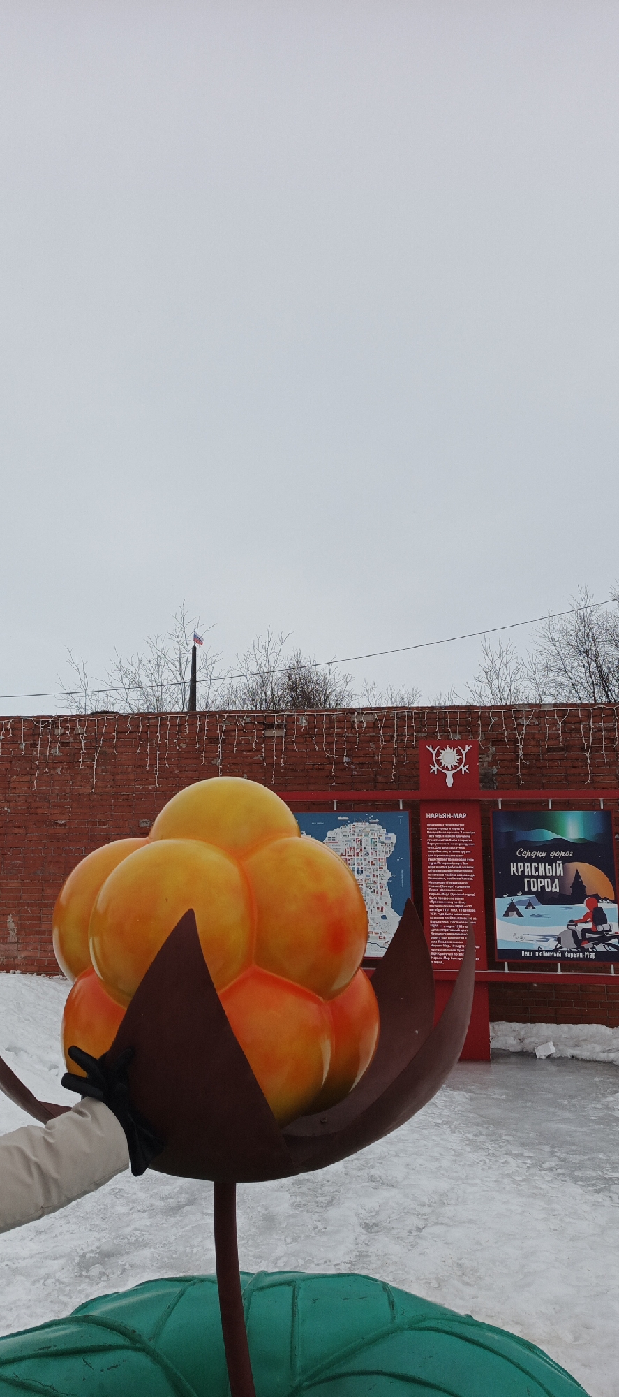 colorful outdoor scene on a cloudy day in Nar'yan-Mar, Russia. The focal point is a large, artificial sculpture of cloudberries, depicted as a cluster of bright orange and yellow fruits enclosed within brown and green leafy structures. The sculpture appears to be on display in a public space, possibly a park or town square, as evidenced by the layer of ice and snow covering the ground. Behind the sculpture, there's a brick wall decorated with strings of lights. Mounted on the wall are information boards with text in Russian; one appears to be a map of Nar'yan-Mar, and another features a poster promoting the city. A hand clad in a beige sleeve and black glove is visible in the foreground, appearing to touch one of the cloudberries.