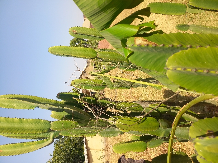 The image presents an outdoor scene dominated by numerous tall, green, columnar succulent plants, exhibiting pronounced vertical ridges and small protrusions along their edges. These plants occupy the majority of the foreground and midground. A broad, green leaf, consistent with a banana plant, is partially visible in the upper right foreground, partially obscuring some of the columnar plants. Intertwined among the main succulents are thinner, yellowish-green stems and some sparse, dry branches. The ground is covered with dry, yellowish-brown grass, suggesting arid conditions. The background features a clear, light blue sky. On the left mid-ground, a segment of a light-colored wall, possibly part of a building, is visible, with green foliage from trees rising behind it. Further to the right in the mid-ground, another building with a light-colored wall and a darker, sloped roof is partially discernible. No individuals, animals, or specific activities are present. The environment and architectural styles are consistent with an outdoor area, likely residential or semi-developed, within the city of Jos, Nigeria.