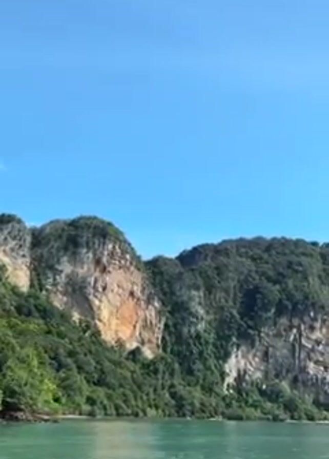 The video depicts a tropical island scenery with a clear blue sky and turquoise water. Rocky cliffs covered with lush green vegetation dominate the landscape. The camera appears to be mounted on a moving boat, capturing the view as it approaches the island. There are no people visible in the frame.