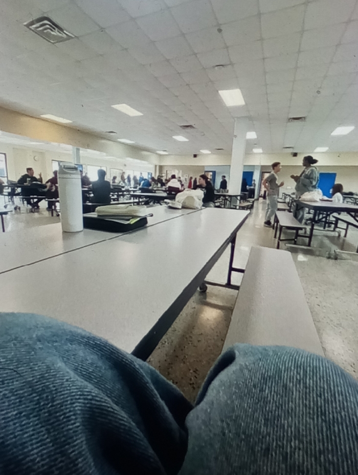 This image depicts an indoor cafeteria or dining hall located in Gulistan, Uzbekistan. The perspective is a first-person, low-angle view from a seated position, with the observer's lower body, clad in blue denim trousers, visible in the foreground, occupying the lower third of the frame. In the immediate foreground, a long, light-colored rectangular table extends from the lower-left towards the midground. Resting on this table are a tall, white cylindrical water bottle and a dark rectangular case or bag, with light-colored papers or a thin book placed on top of it. An attached light-colored bench, corresponding to the table, is partially visible on the right side of the observer's legs. The midground and background reveal a spacious room populated by approximately twenty to thirty individuals. The room is brightly illuminated by numerous rectangular fluorescent light fixtures recessed into a white drop-tile ceiling. The floor is a speckled, light-colored tile. Multiple long rectangular tables with attached benches, consistent with a school or institutional cafeteria, are arranged throughout the space. People are engaged in various activities: some are seated at tables, appearing to eat or socialize; others are standing and conversing. On the central right, two individuals are standing facing each other, engaged in an interaction; one male wears a light-colored t-shirt and trousers, and one female wears a light-colored long-sleeved top. Further into the background on the left, more individuals are seated at tables, with some appearing to gesture. Windows are visible along the far-left wall, indicating an external view, and a doorway or opening is present on the far-right wall. The overall scene suggests a busy communal gathering space.