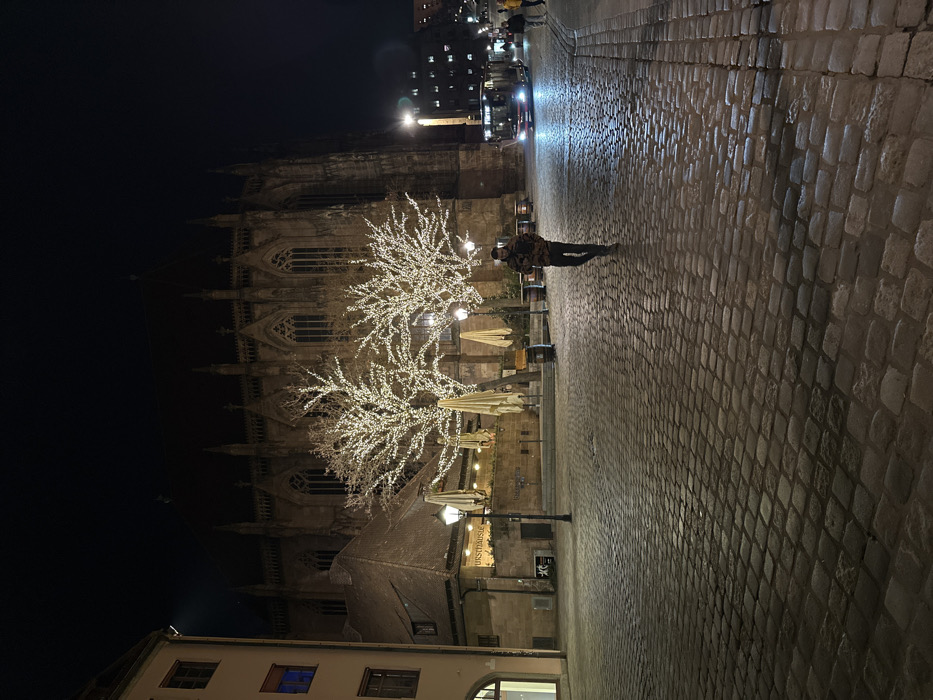 The image depicts a night scene on a cobblestone square in Nuremberg, Germany, adjacent to the St