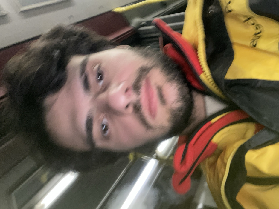 A close-up selfie depicts a man with dark, curly hair and a beard. He has dark eyes and a fair complexion. He's wearing a yellow jacket with black accents and a red collar. The background appears to be the interior of a vehicle, possibly a bus or train, with a silver handrail visible. The lighting is somewhat dim, and the image has a slightly tilted perspective.