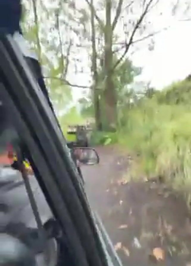 A person is driving a car on a dirt road through a forest. Other vehicles are visible ahead on the same road. Trees and lush vegetation surround the road. The weather appears overcast. The camera is positioned inside the car, focusing on the driver's side view.