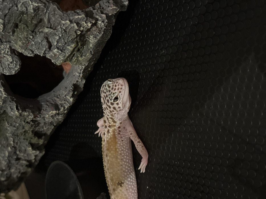 - "A leopard gecko, with a light pinkish-white body adorned with scattered brown spots and a distinct pattern of darker brown spots on its head and dorsal ridge, is positioned on a black, textured mat" by FM-sTvb12, licensed under CC BY 4.0